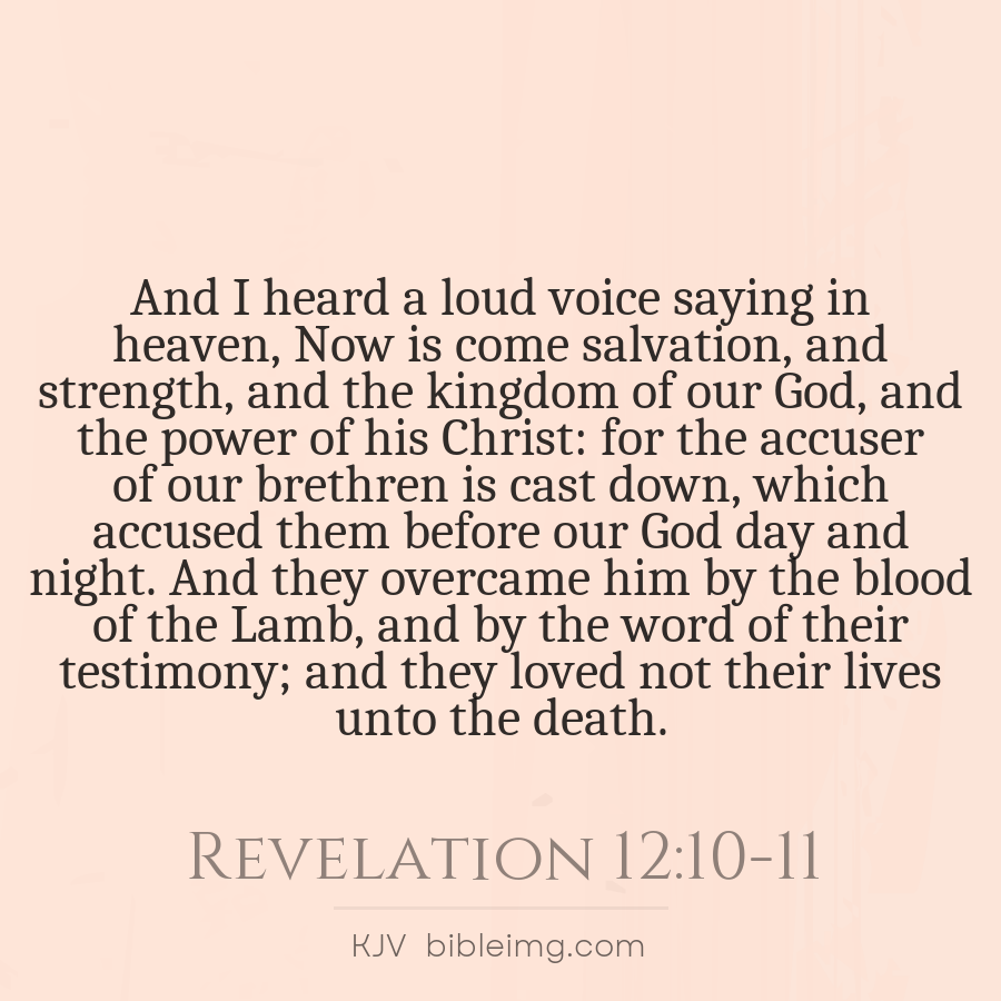 And I heard a loud voice saying in heaven, Now is come salvation, and strength, and the kingdom of our God, and the power of his Christ: for the accuser of our brethren is cast down, which accused them before our God day and night. And they overcame him by the blood of the Lamb, and by the word of t