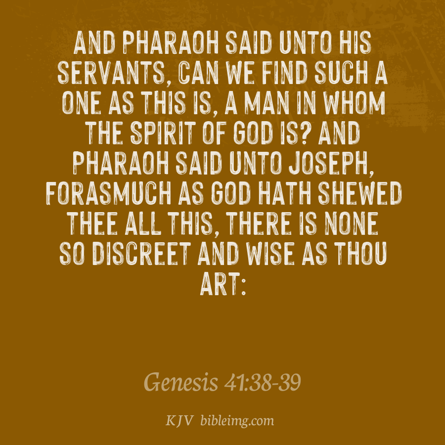 And Pharaoh said unto his servants, Can we find such a one as this is, a man in whom the Spirit of God is? And Pharaoh said unto Joseph, Forasmuch as God hath shewed thee all this, there is none so discreet and wise as thou art:
