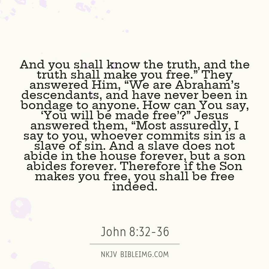 And ye shall know the truth, and the truth shall make you free. They answered him, We be Abraham's seed, and were never in bondage to any man: how sayest thou, Ye shall be made free? Jesus answered them, Verily, verily, I say unto you, Whosoever committeth sin is the servant of sin. And the servant