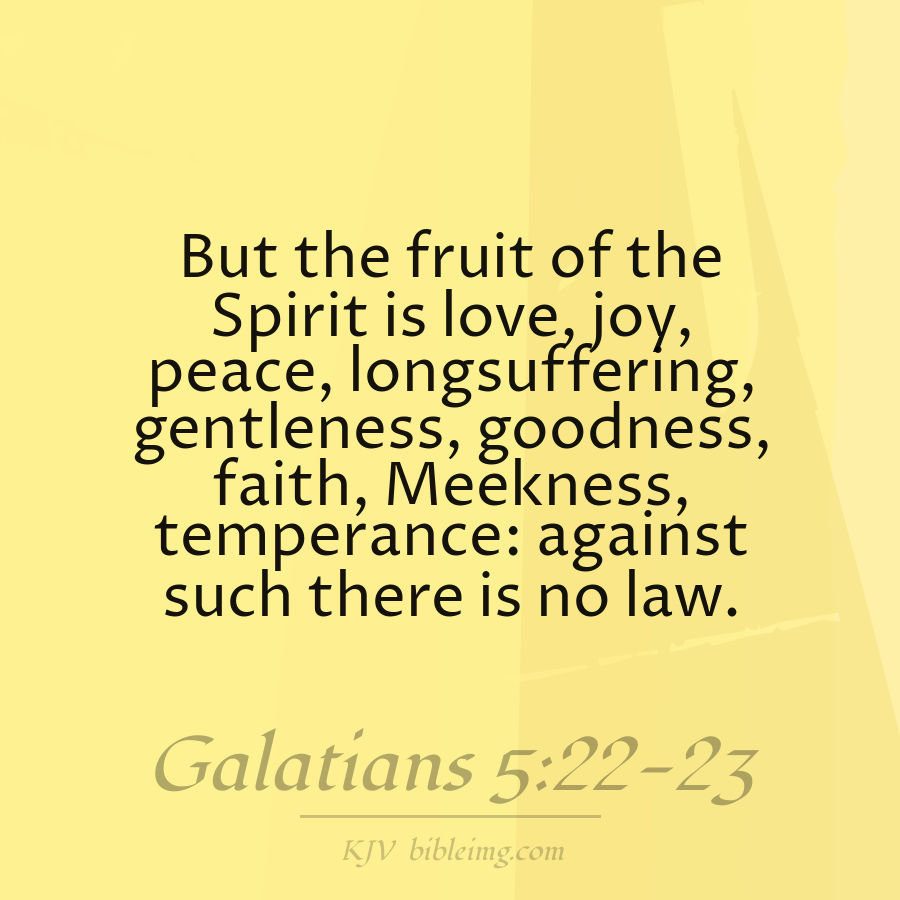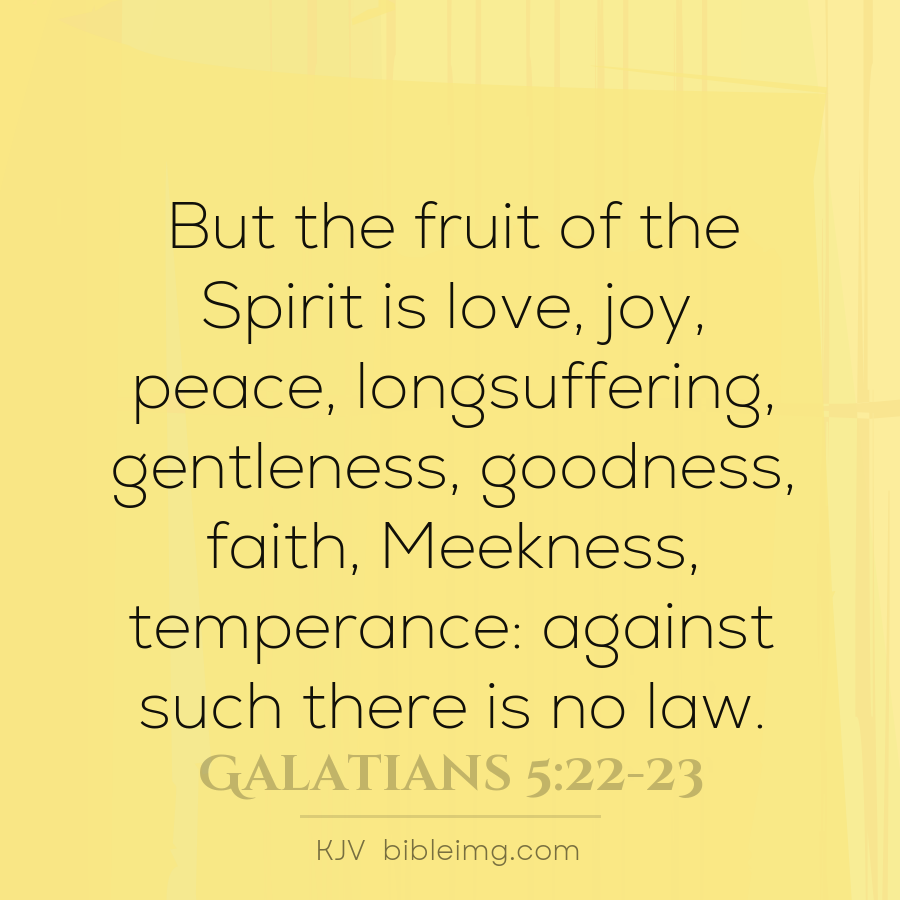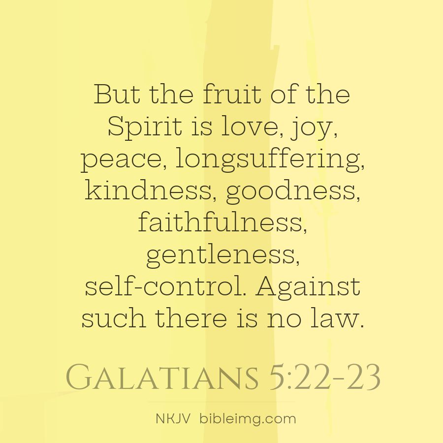 But the fruit of the Spirit is love, joy, peace, longsuffering, kindness, goodness, faithfulness, gentleness, self-control. Against such there is no law.
