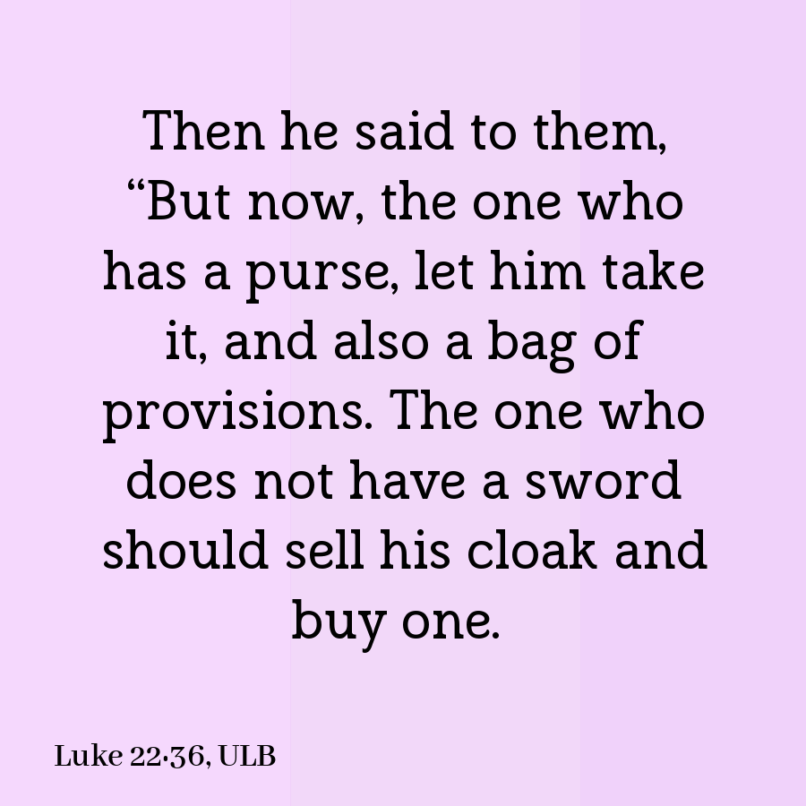 Then he said to them, “But now, the one who has a purse, let him take it, and also a bag of provisions. The one who does not have a sword should sell his cloak and buy one.