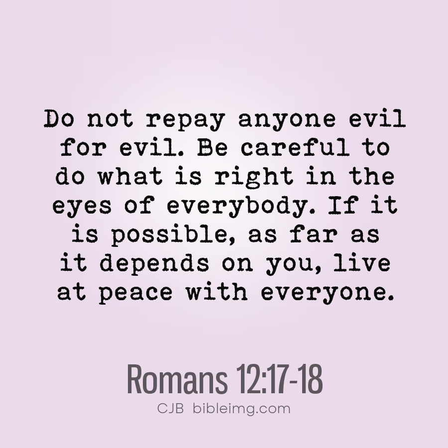 Do not repay anyone evil for evil. Be careful to do what is right in the eyes of everybody. If it is possible, as far as it depends on you, live at peace with everyone.