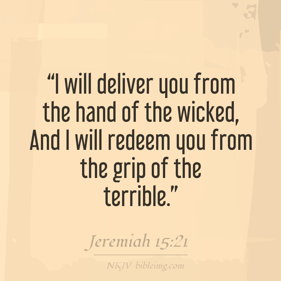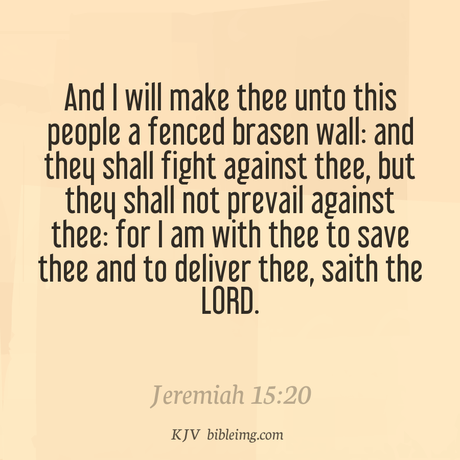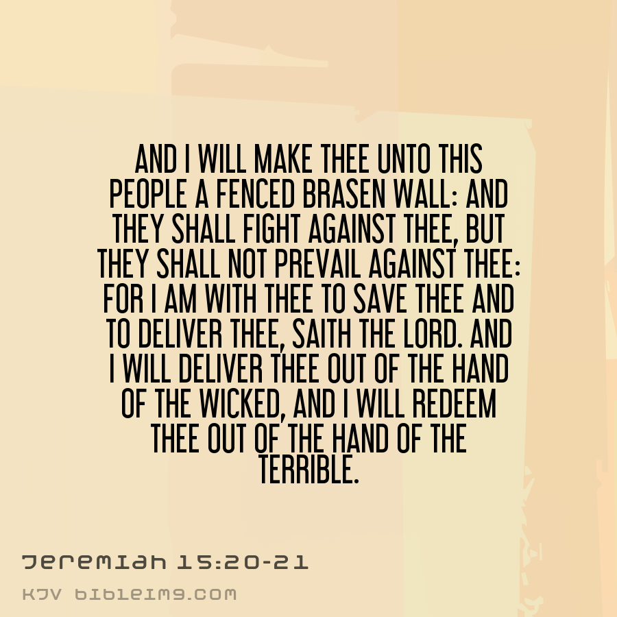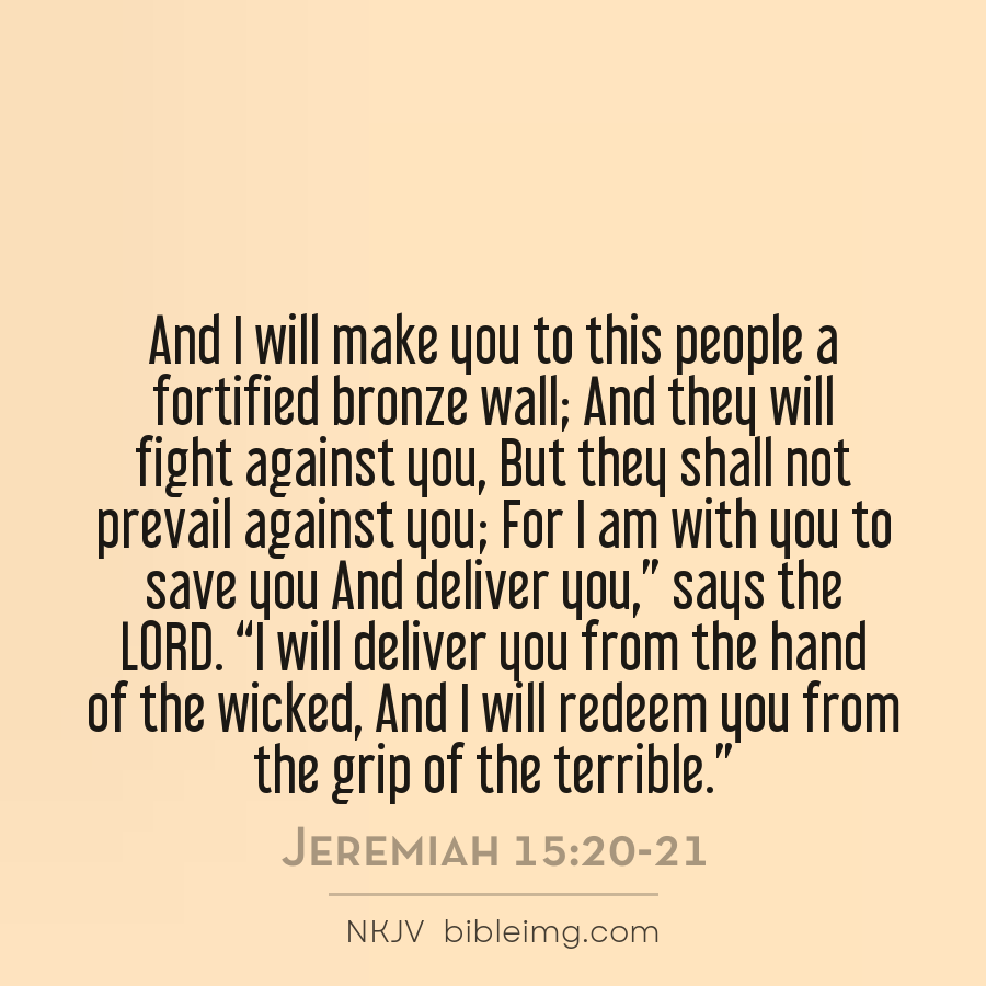 And I will make thee unto this people a fenced brasen wall: and they shall fight against thee, but they shall not prevail against thee: for I am with thee to save thee and to deliver thee, saith the LORD. And I will deliver thee out of the hand of the wicked, and I will redeem thee out of the hand o