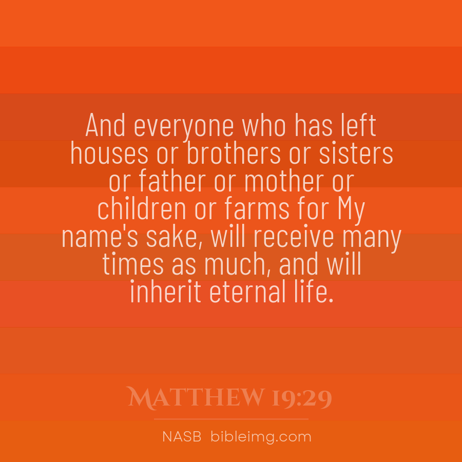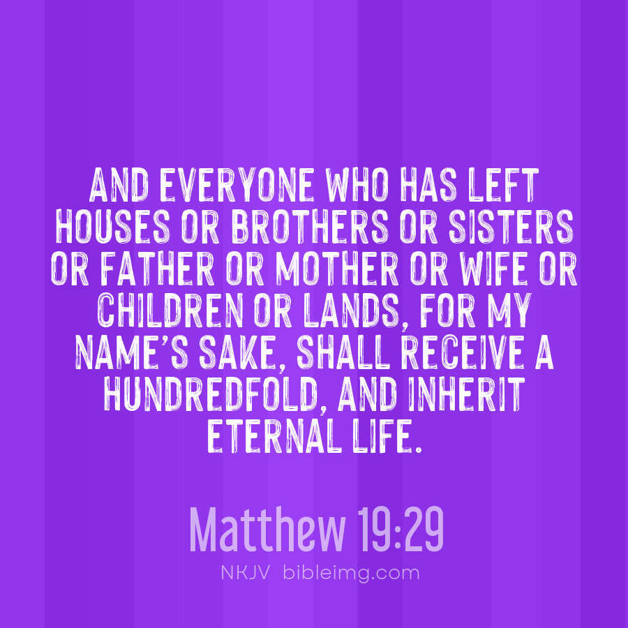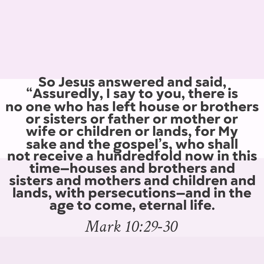 So Jesus answered and said, “Assuredly, I say to you, there is no one who has left house or brothers or sisters or father or mother or wife or children or lands, for My sake and the gospel’s, who shall not receive a hundredfold now in this time—houses and brothers and sisters and mothers and childre