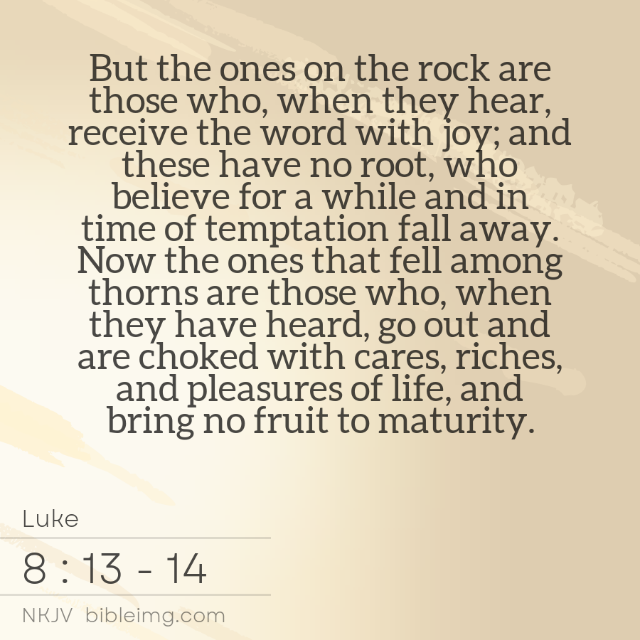 But the ones on the rock are those who, when they hear, receive the word with joy; and these have no root, who believe for a while and in time of temptation fall away. Now the ones that fell among thorns are those who, when they have heard, go out and are choked with cares, riches, and pleasures of