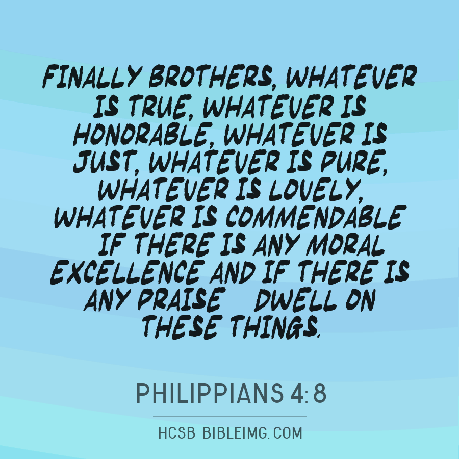 Finally brothers, whatever is true, whatever is honorable, whatever is just, whatever is pure, whatever is lovely, whatever is commendable — if there is any moral excellence and if there is any praise — dwell on these things.