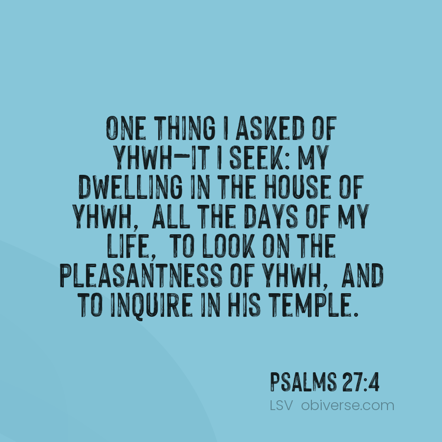 One thing I asked of YHWH—it I seek: My dwelling in the house of YHWH, All the days of my life, To look on the pleasantness of YHWH, And to inquire in His temple.