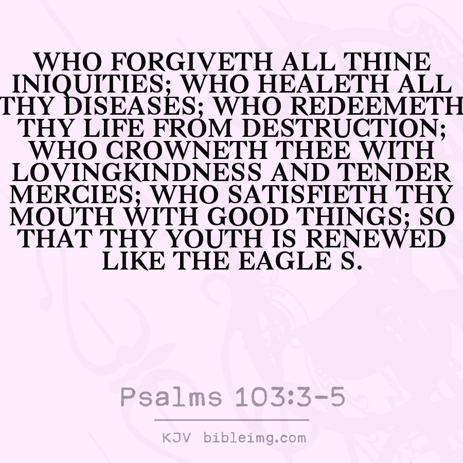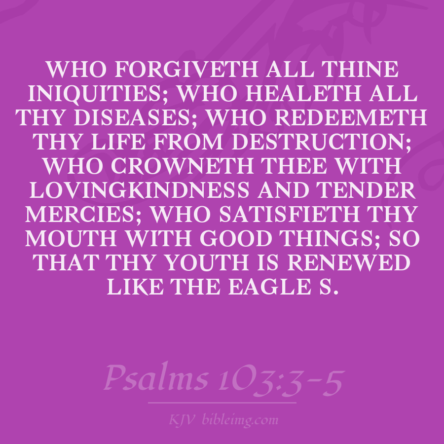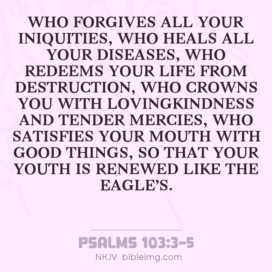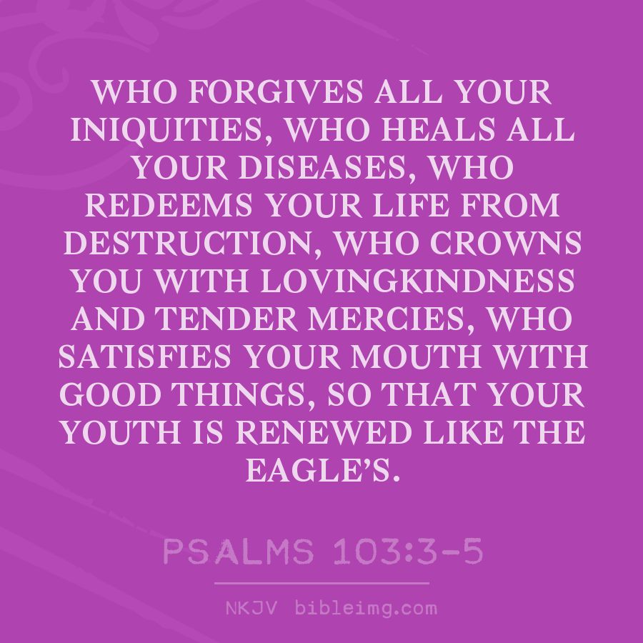 Who forgives all your iniquities, Who heals all your diseases, Who redeems your life from destruction, Who crowns you with lovingkindness and tender mercies, Who satisfies your mouth with good things, So that your youth is renewed like the eagle’s.