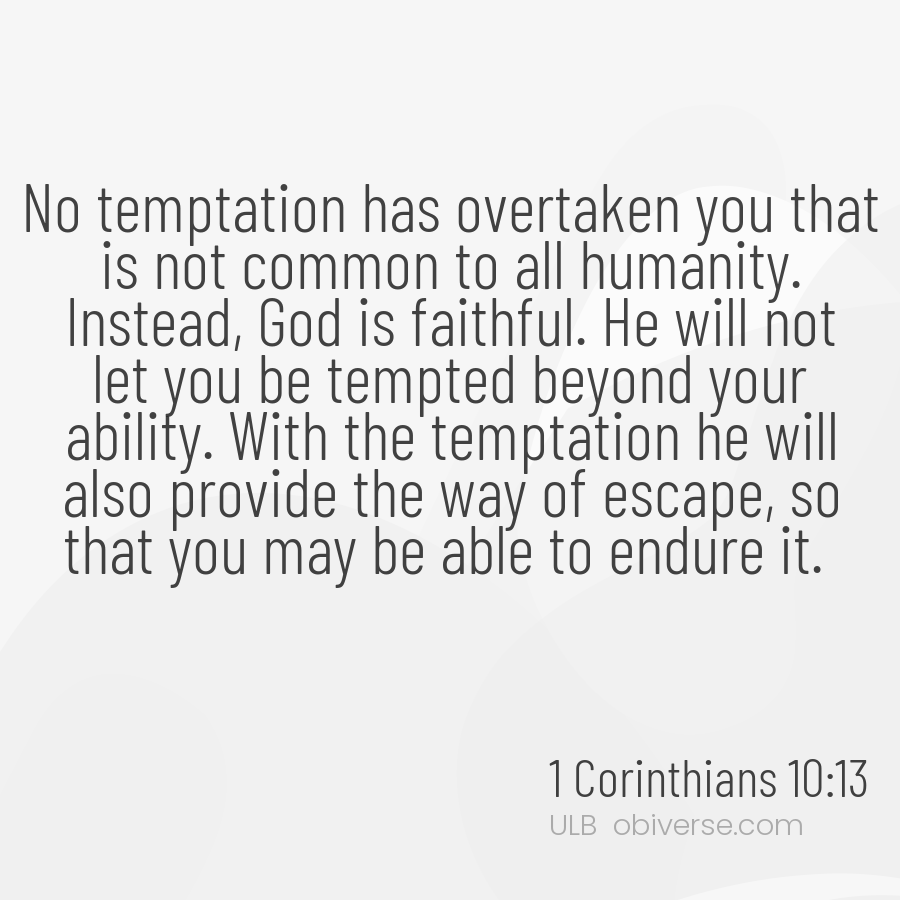 No temptation has overtaken you that is not common to all humanity. Instead, God is faithful. He will not let you be tempted beyond your ability. With the temptation he will also provide the way of escape, so that you may be able to endure it.