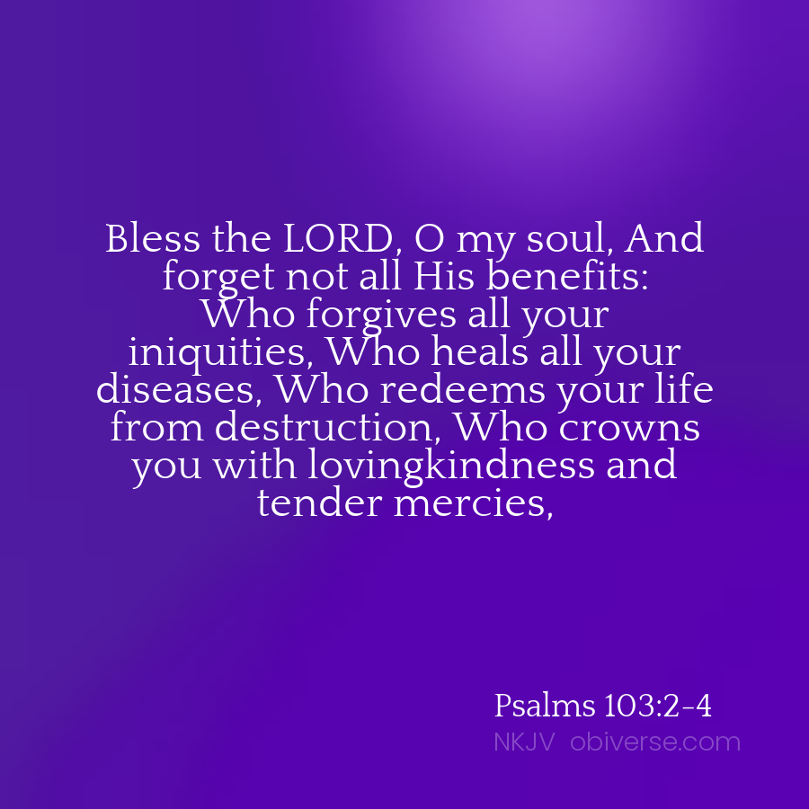 Bless the LORD, O my soul, And forget not all His benefits: Who forgives all your iniquities, Who heals all your diseases, Who redeems your life from destruction, Who crowns you with lovingkindness and tender mercies,