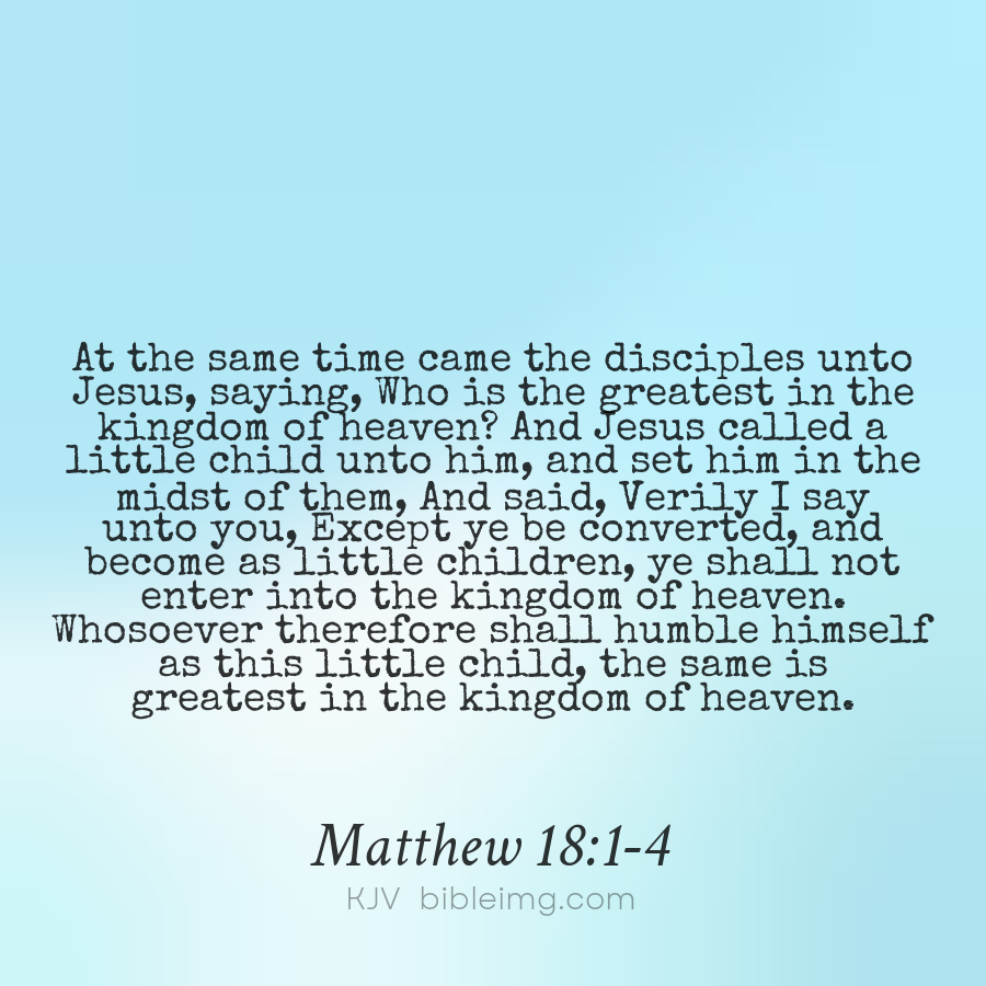 At the same time came the disciples unto Jesus, saying, Who is the greatest in the kingdom of heaven? And Jesus called a little child unto him, and set him in the midst of them, And said, Verily I say unto you, Except ye be converted, and become as little children, ye shall not enter into the kingdo